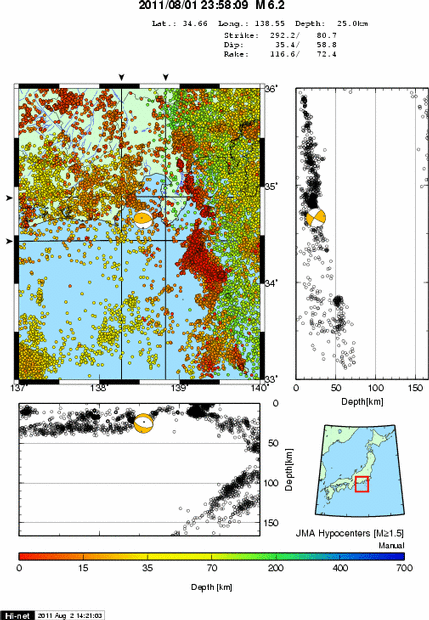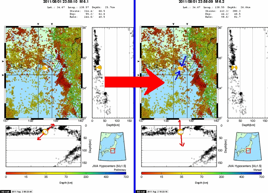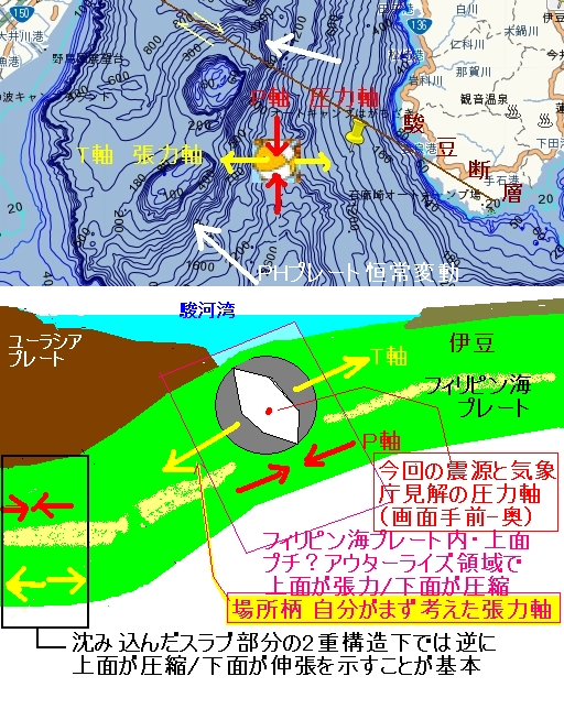 一連のスラブ内地震とは別 若干の横ズレ成分(恐らく右横ずれ)を含む逆断層型・・ ただし南南西-北北東(ほとんど南-北)に主圧力軸を示すもの(訂正済) つまり東海地震の想定震源節面とは調和的ではない。 「若干の海面変動が見られる可能性」に言及していたので、プレートの噛合後の震央ではなく、 かみ合うごく手前の、フィリピン海プレートがまだ海底岩盤として露出した位置での震央になります。 (定義上、もぐり込む以前なのでスラブとは呼ばない位置) ※8/6追記 Hi-netさん、再々解析で3度目の発震機構解提示ですね(2度の差し替え) ←3度目の改訂版 詳細報告はttp://www.hinet.bosai.go.jp/topics/s-suruga-bay110801/ 余震分布との調和はこれが一番ありますね。 (もしくは余震から節面を求め直し、元々の足りない情報を補完したのかも) これであれば半信半疑だったフィリピン海プレート北上活性化による、 南北圧力軸を採ることが迷い無くできます。 いずれにせよ相模湾~719~今回と続く発震及び、房総沖南部や 関東フラグメント付近での千葉・茨城発震のメカニズム解を見ている限り、 フィリピン海プレートが北上を活性化し、その歪でガクッと割れる発震が目立ちます。 過去になかった訳ではありませんが、頻度は明らかに増加。 気象庁が出していた速報との一番の違いをあえて言うと、 震央が陸側プレート会合の先か手前かの判断。 気象庁はM6前半と言う規模を考慮した上で会合手前の海底岩盤内部と判断し、 「若干の海面変動の恐れ」に言及していましたが、 Hi-net解析では会合の先(西側)、スラブ内地震だと読み取れる報告に。 ============================ 気象庁発表 フィリピン海プレート内部を震源とするモノと発表。 陸側ユーラシアプレートに設置されている体積歪計や恐らく傾斜計には、 東海地震に繋がる変動はナシ。 図1は震源と規模+7/19早朝の震源位置をピンで並べたもの 図2は図3左側の変更前のHi-net情報を元に「張力軸を採用した発震機構解」の自説(後に却下) 図3は訂正された発震機構解(圧力軸優先) ================= 震源地 駿河湾南部 震源時 2011/08/02 20:30:58.71 緯度 34.666N 経度 138.566E 深さ 21.4km マグニチュード 3.0 震源地 駿河湾南部 震源時 2011/08/02 20:42:30.62 緯度 34.674N 経度 138.548E 深さ 24.1km マグニチュード 2.8 M3.0とM2.8からすると、昨夜の地殻内部での破壊面は南側が北側に潜り込む逆断層かな? (ふたつとも昨夜の余震でM2.8の方はスラブ領域まで掛かっているっぽい) P.S. 連絡先を知らない相手で、ある意味良かったのかな? 手段があれば勢いでメルかTELしてしまったかも知れないから(迷惑の素) まぁ、とても切なくなってしまうのだけれども・・・。 |