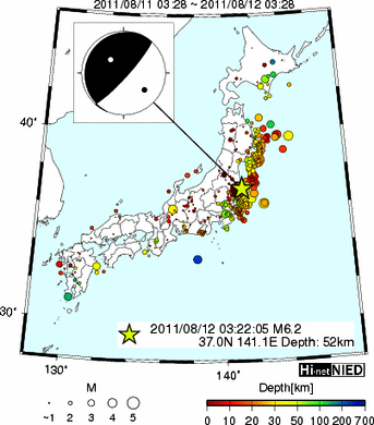 AQUA-REAL 震源時 2011-08-12 03:22:03.69 震央緯度 37.0N 震央経度 141.4E 震源深さ 49.8km マグニチュード 6.8 Hi-net速報値の深さならプレート境界面=311余震 子カエルはもっと浅い表示なので、そうなると陸側プレート |