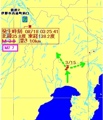 M: 3.8 発生時刻: 08/18 03:25:41 北緯35.8度 東経138.2度 深さ 10km −−−−−−追記−−−−−− |