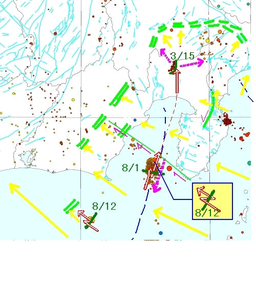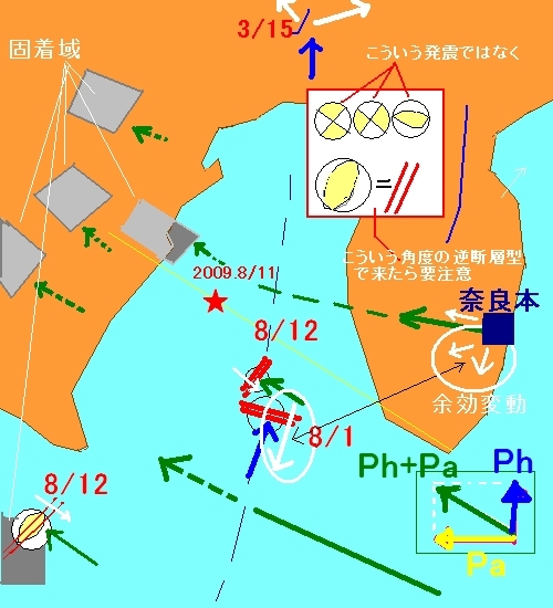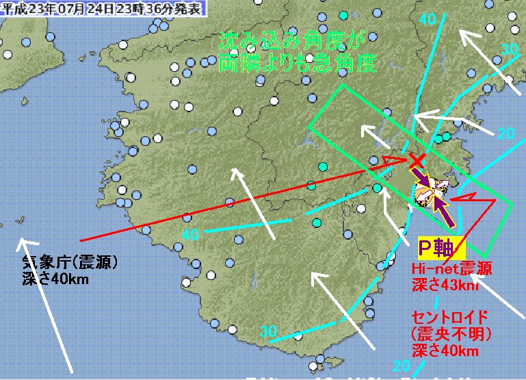 太平洋プレート内部スラブ内地震(311による誘発系) 西北西-東南東に圧力軸をもつ逆断層型 07/10 09:57:15 宮城県東方はるか沖 M7.0 太平洋プレート内部スラブ内地震(311による誘発系) 西北西-東南東に張力軸をもつ横ズレ型 07/25 03:51:25 福島県東方沖 M6.6 プレート境界面地震(311の余震) 西北西-東南東に圧力軸をもつ低角逆断層型 07/25 20:04:46 宮城県東方沖 M5.6 太平洋プレート内部スラブ内地震(311による誘発系) 西-東に圧力軸をもつ左横ズレ型 ※数分後の20:10に起きた隣接地発震はこれの延長破壊面と思われる(余震) 07/26 06:33:13 岩手県東方沖 M5.3 陸側オホーツクプレート上面断層地震(311による誘発系) 北西-南東に張力軸をもつ正断層型 |