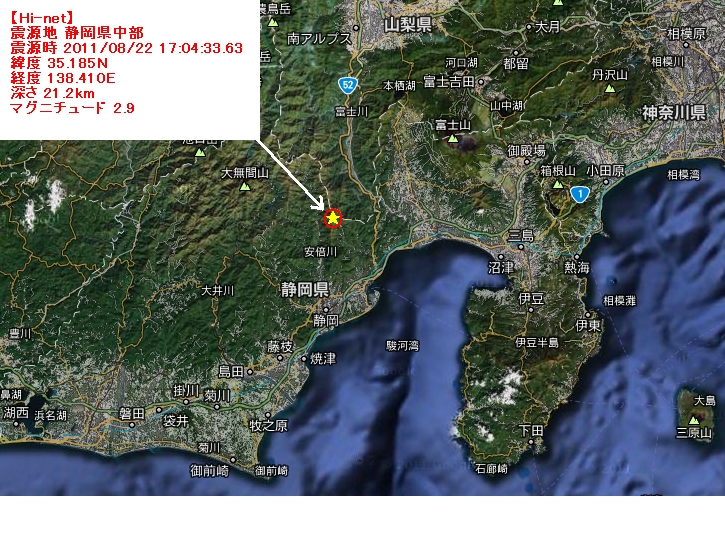 ================================ 発生時刻 2011年8月1日 19時1分ごろ 震源地 駿河湾 緯度 北緯34.9度 経度 東経138.4度 深さ 30km 規模 マグニチュード 2.5 震度1 静岡県 静岡県中部 静岡駿河区 静岡駿河区曲金 ================================ |