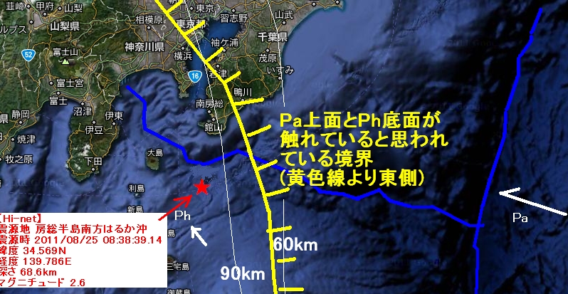 AQUA-REAL 震源時 2011-08-12 03:22:03.69 震央緯度 37.0N 震央経度 141.4E 震源深さ 49.8km マグニチュード 6.8 Hi-net速報値の深さならプレート境界面=311余震 子カエルはもっと浅い表示なので、そうなると陸側プレート |